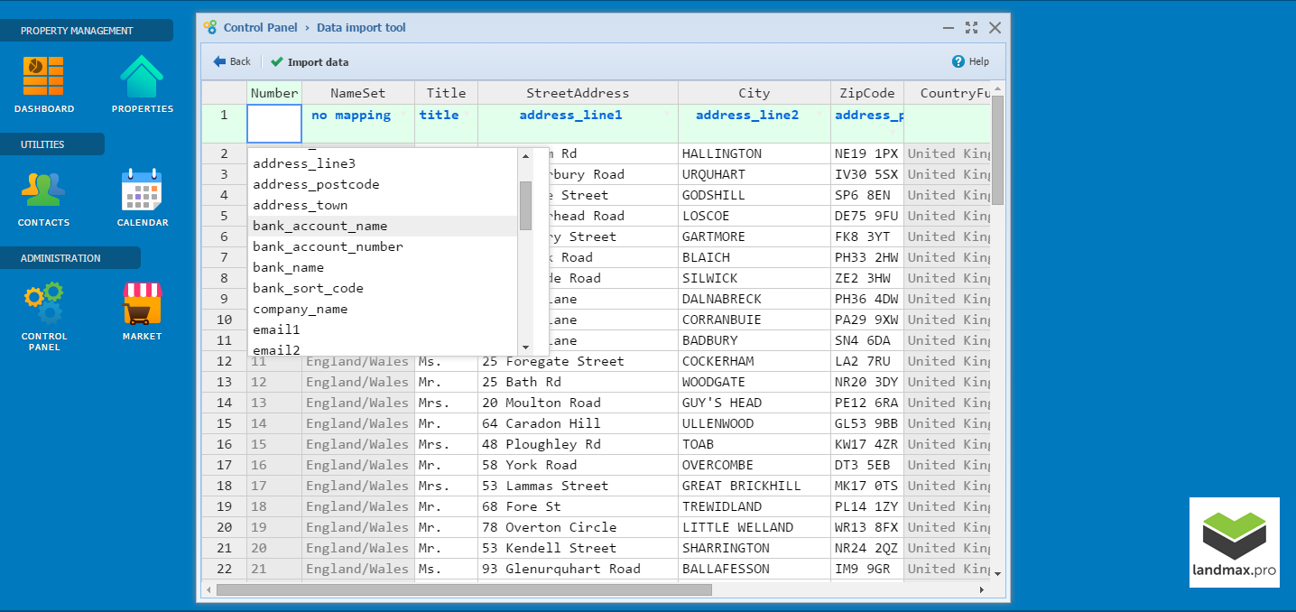 With our import data tool, you can import your data from your existing software system, marketing lists and any CSV file, that match the fields within landmax.pro.